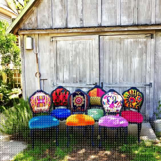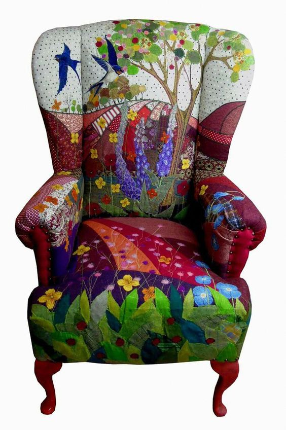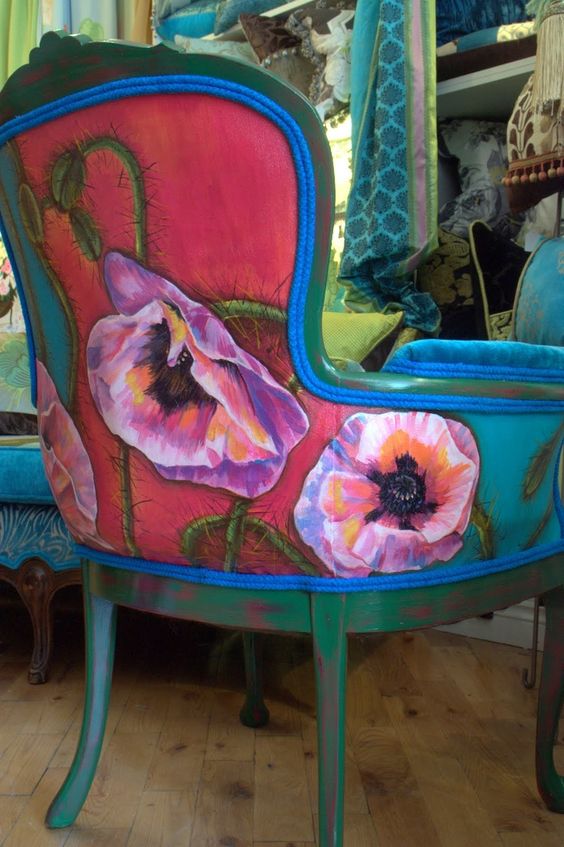 I've been gathering photos of these wonderful chairs for some time now and all of them are not hand painted, Some are upholstered in multiple fabrics. Some have been adorned with embroidered fabric, and some have vintage stitchery worked into them, The options are limited only by your imagination. However they are designed, they are stunning. Plain chairs have lost their allure for me ... unless I want to hand paint it myself! Finding a chair to transform is pretty easy today .... just check out any flea or antique market.